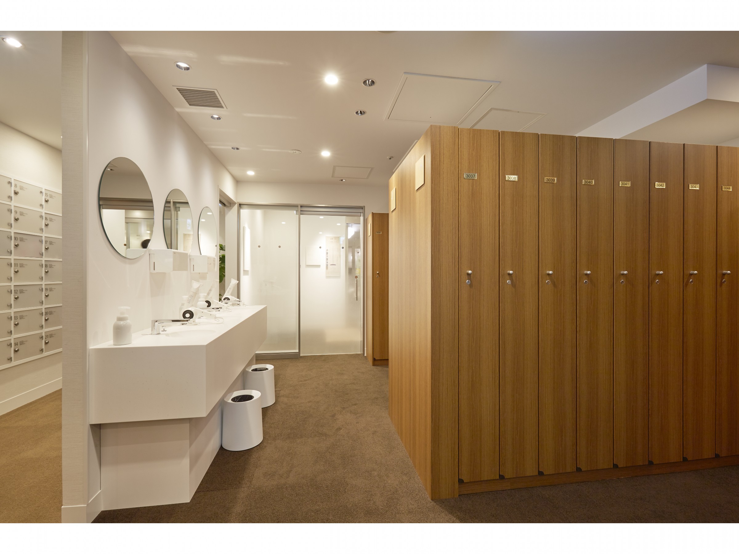 細長いロッカーがずらっと並んだロッカールーム。ロッカーの中には館内着のガウンとバスタオルが入っていました。脱衣所と浴室の間にも荷物用の小さなロッカーが並んでいるスペースの間。そこにたくさんのフェイスタオルが積んであったり食用の氷も置いてありました。今まで体験してきた男性専用施設と似たサウナー向けの動線です。