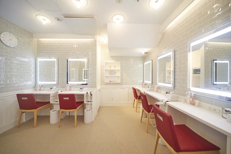 とても綺麗で女子力が高い浴室で上質なスパ体験をした後は、館内着のガウンを着て身支度。脱衣所にもドライヤーや洗面台がありますが、ダイニングスペースの方に進むとパウダールームがあります。広さやアメニティ類もそちらが充実してました。