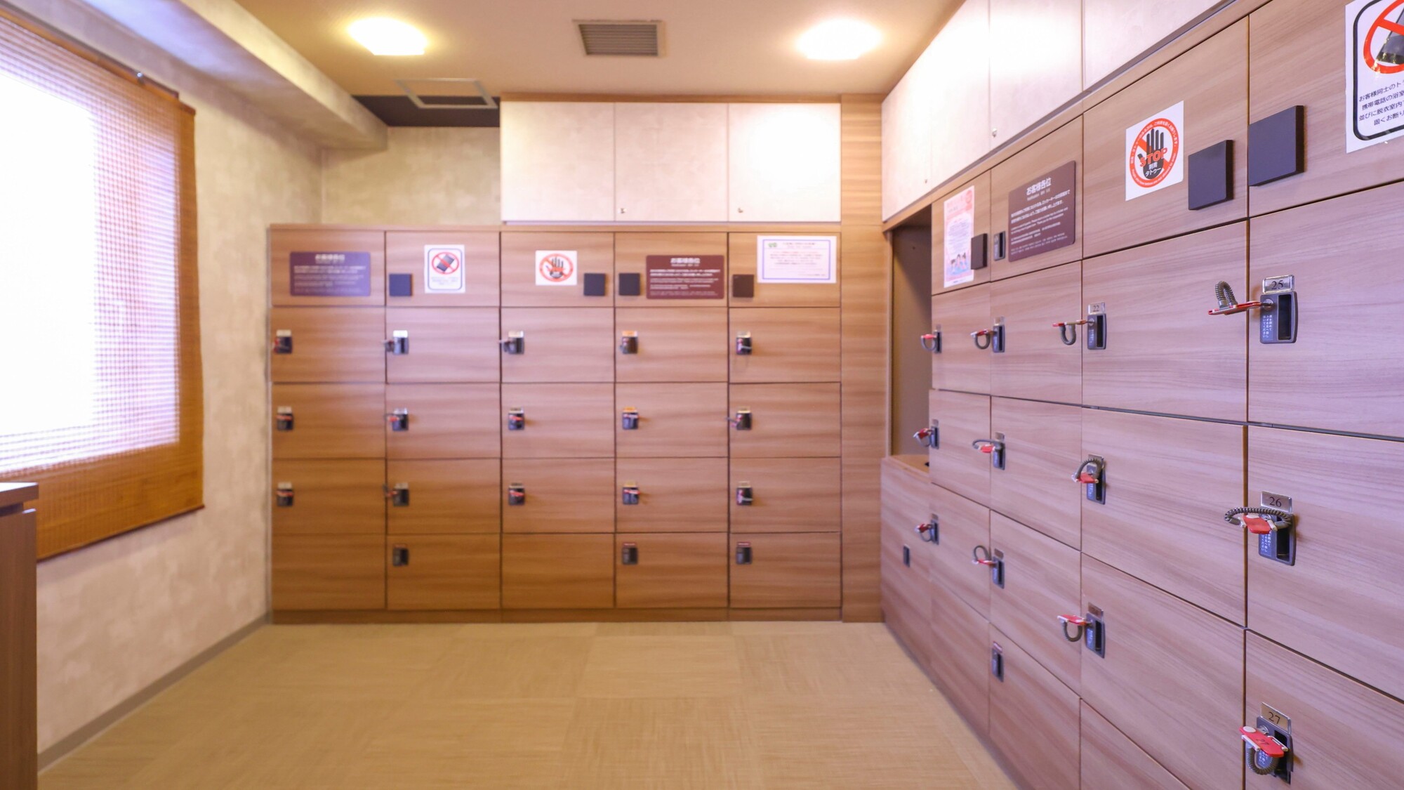 - 女性の大浴場入口は暗証番号式。チェックイン時に必ず受け取ること