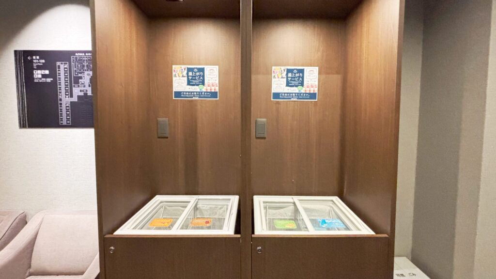スパ棟へは靴(スリッパ)を脱いで入館。スリッパは誰のものかわからなくなるので、靴棚にあるビニール袋に入れて持ち物と一緒にして入ることをおすすめします。万が一スリッパがなくなっていても、フロントに一言声をかければ新しいものを用意してくれます。