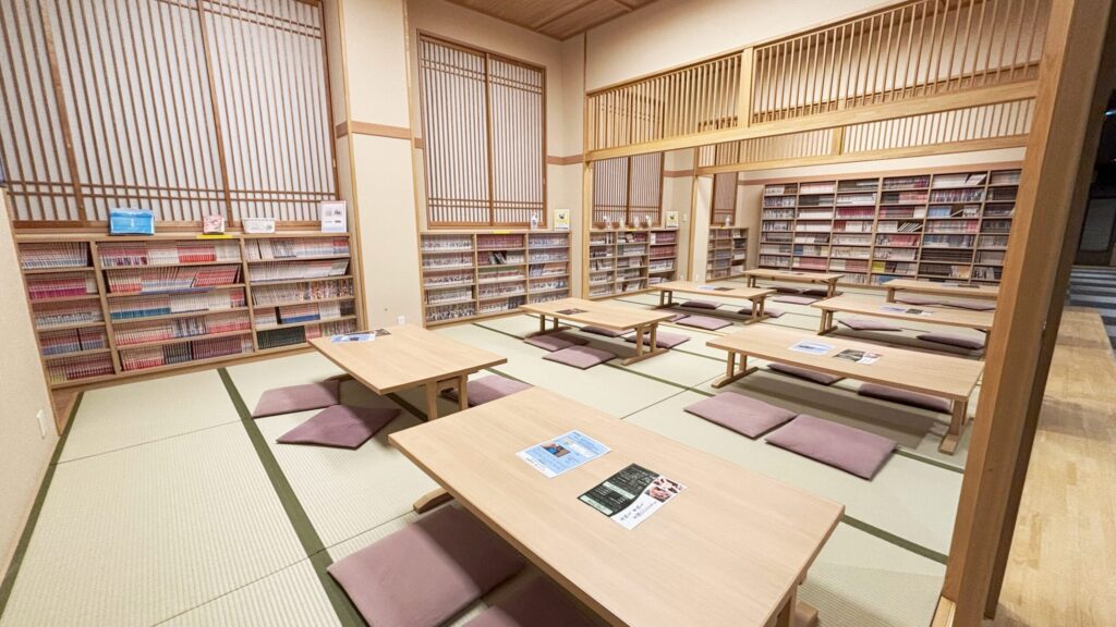 大広間の壁沿いにはたくさんの漫画がずらり!日帰り温泉の利用者はここで思う存分にくつろぐことができるし、宿泊者は、5冊までなら漫画を部屋に持って行くことも可能だそうです。
