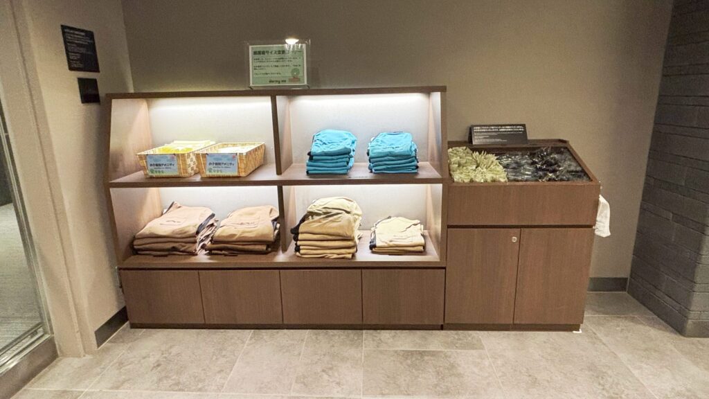 受付を済ませて、宿泊棟に向かう途中にアメニティが揃ってました(ハブラシ、ブラシ、カミソリ、綿棒など)。館内着もありますが、部屋にも置いてあります。