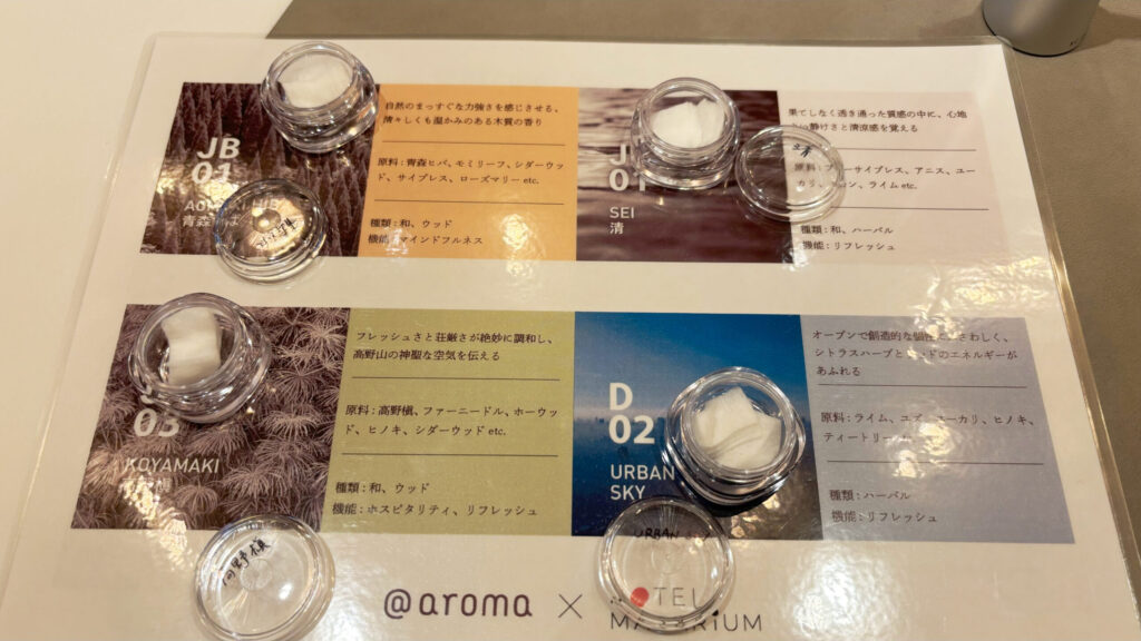 セルフロウリュ用のアロマは4種類の中から好きな匂いのものを一つ選べました。